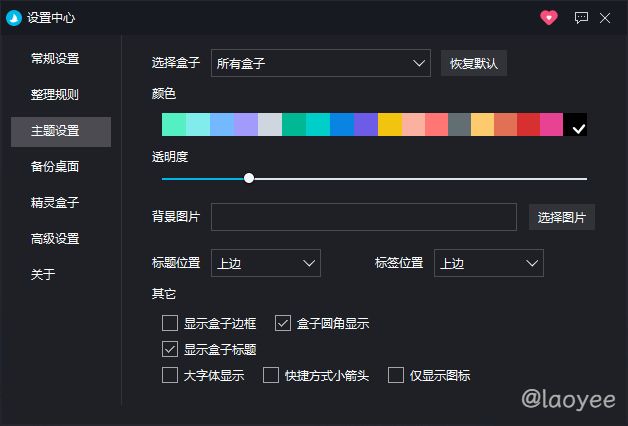 软件可以设置整理规则,不过老夜更倾向于自行手动整理,如果你想实现像老夜桌面一样的效果就可以在主题设置中配置